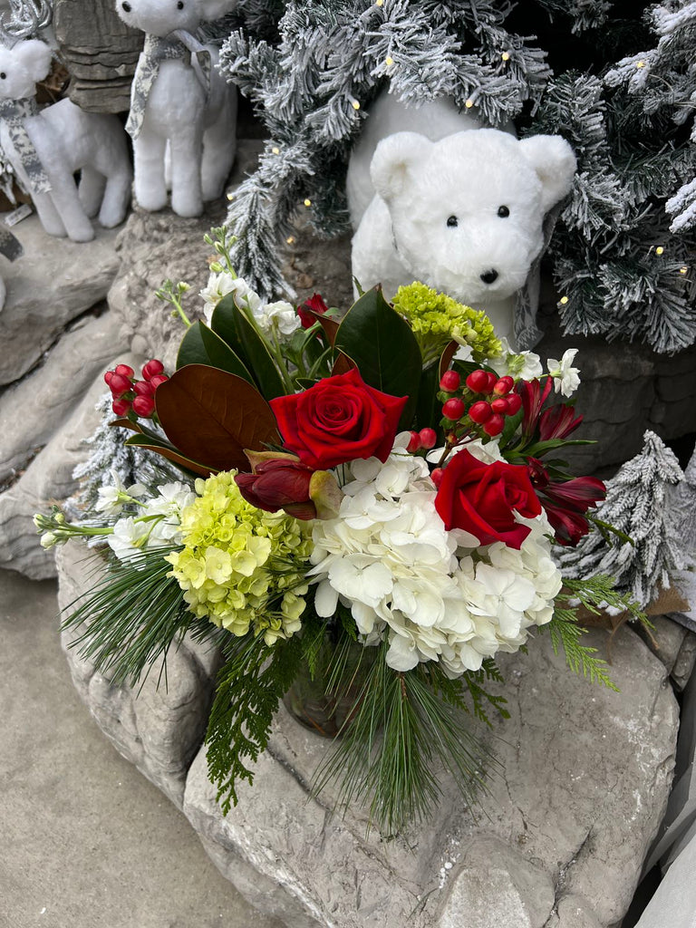 Designed in a classic glass vase, includes amaryllis, magnolia and other luxe florals, with winter greens.