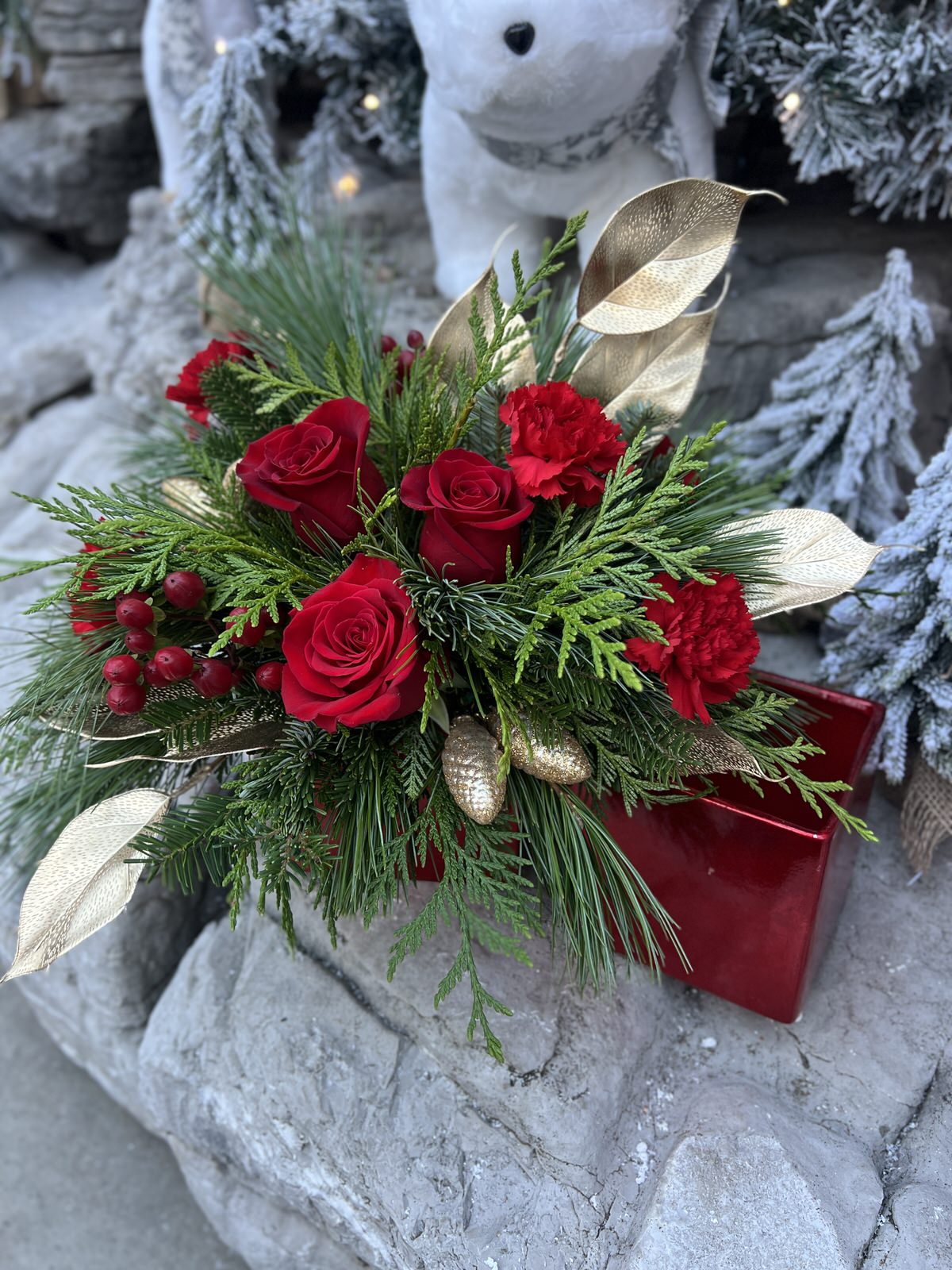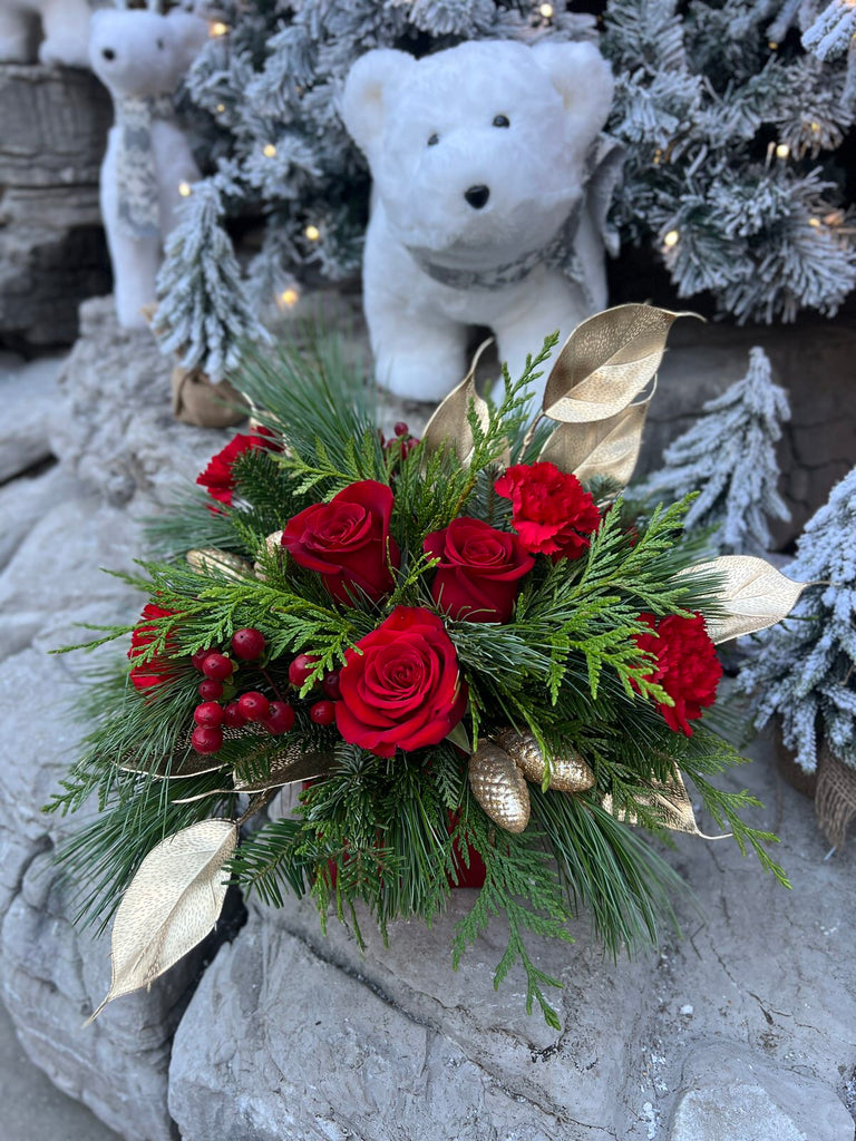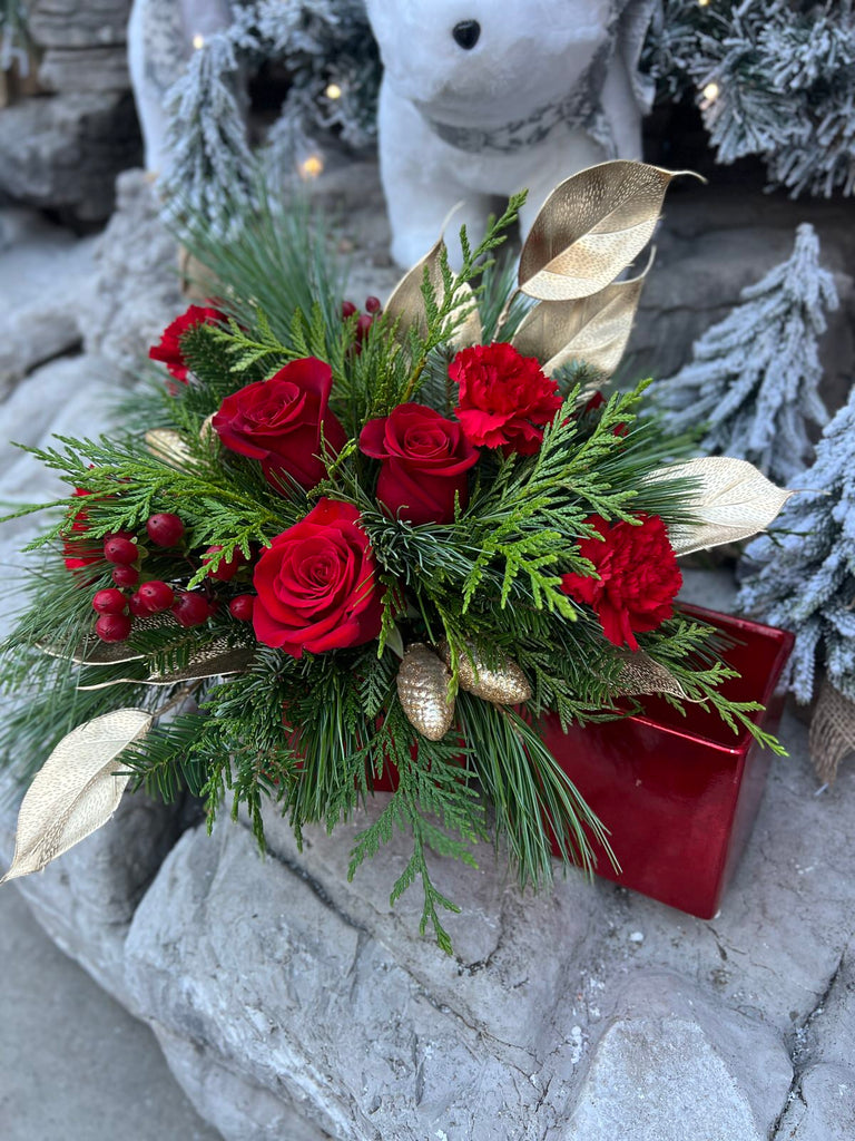 A romantic red mix featuring roses and winter greens accented with faux gold leaves and pinecones. Designed in a metallic red pot.