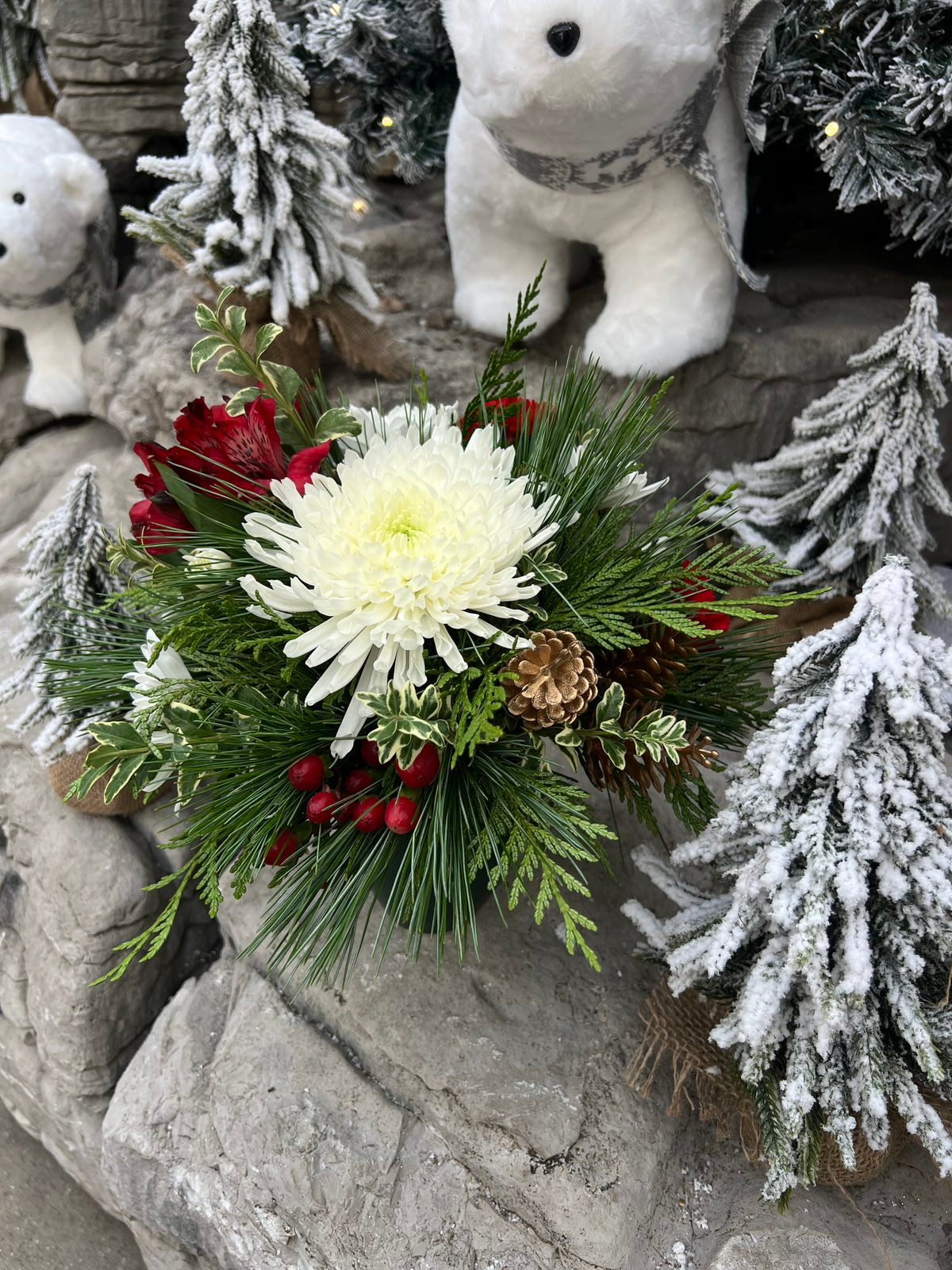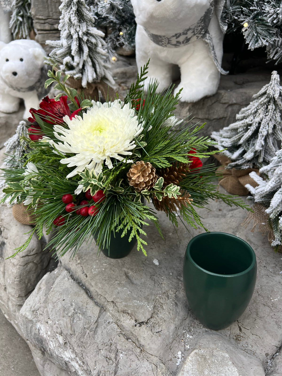 Designed in a modern handless mug a mix of long lasting seasonal florals and foliage. Accented with faux gold pinecones. A great host gift!