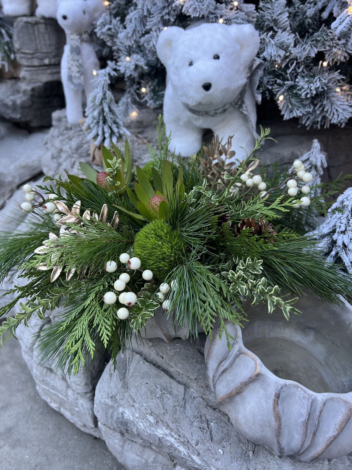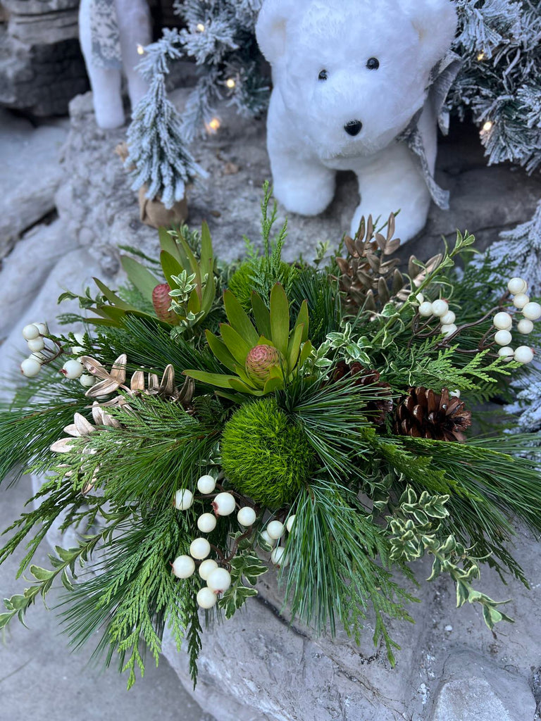 Designed in a stone bowl with a bed of winter greens, long lasting leucadendron and dianthus, accented with faux berries and gold picks.
